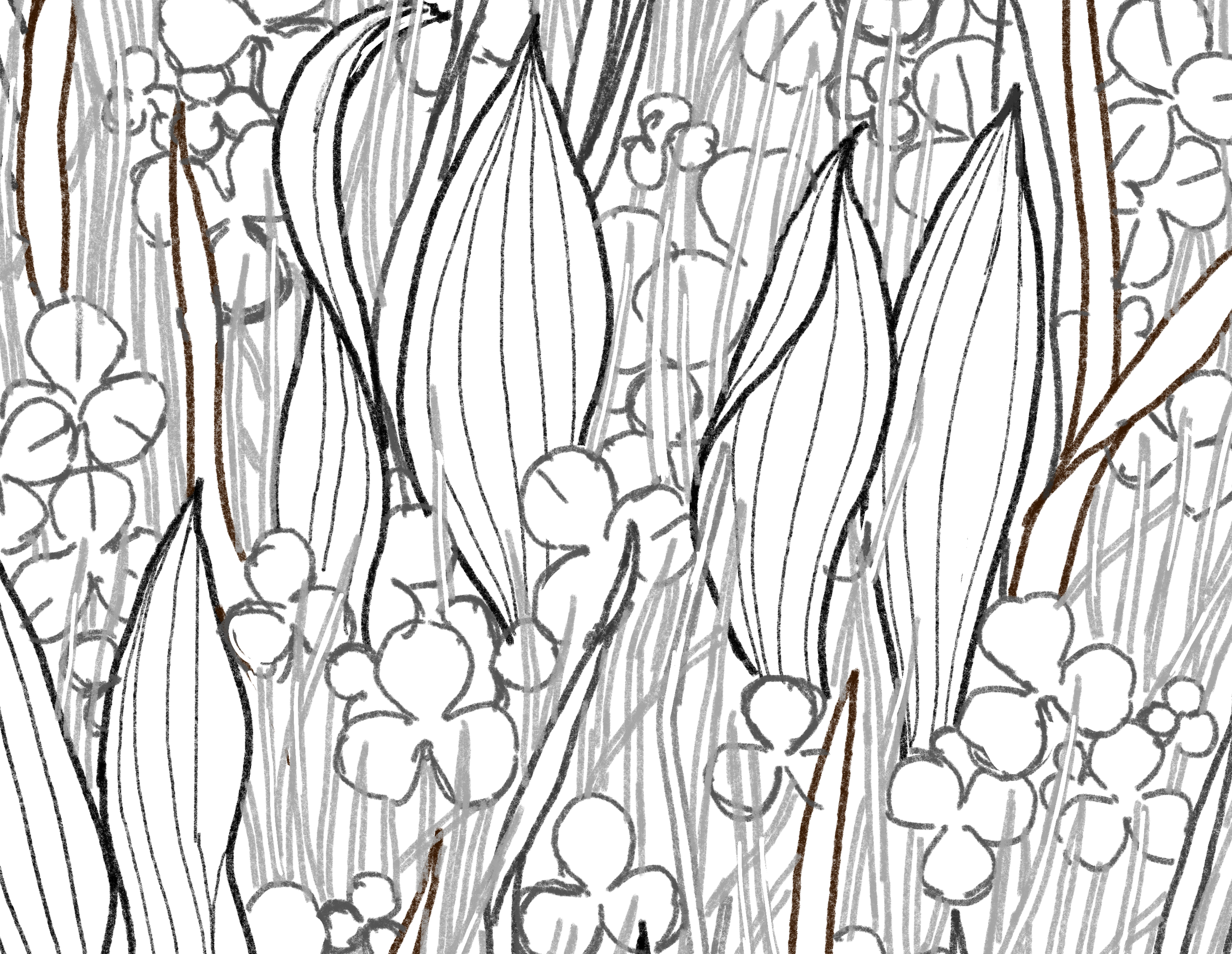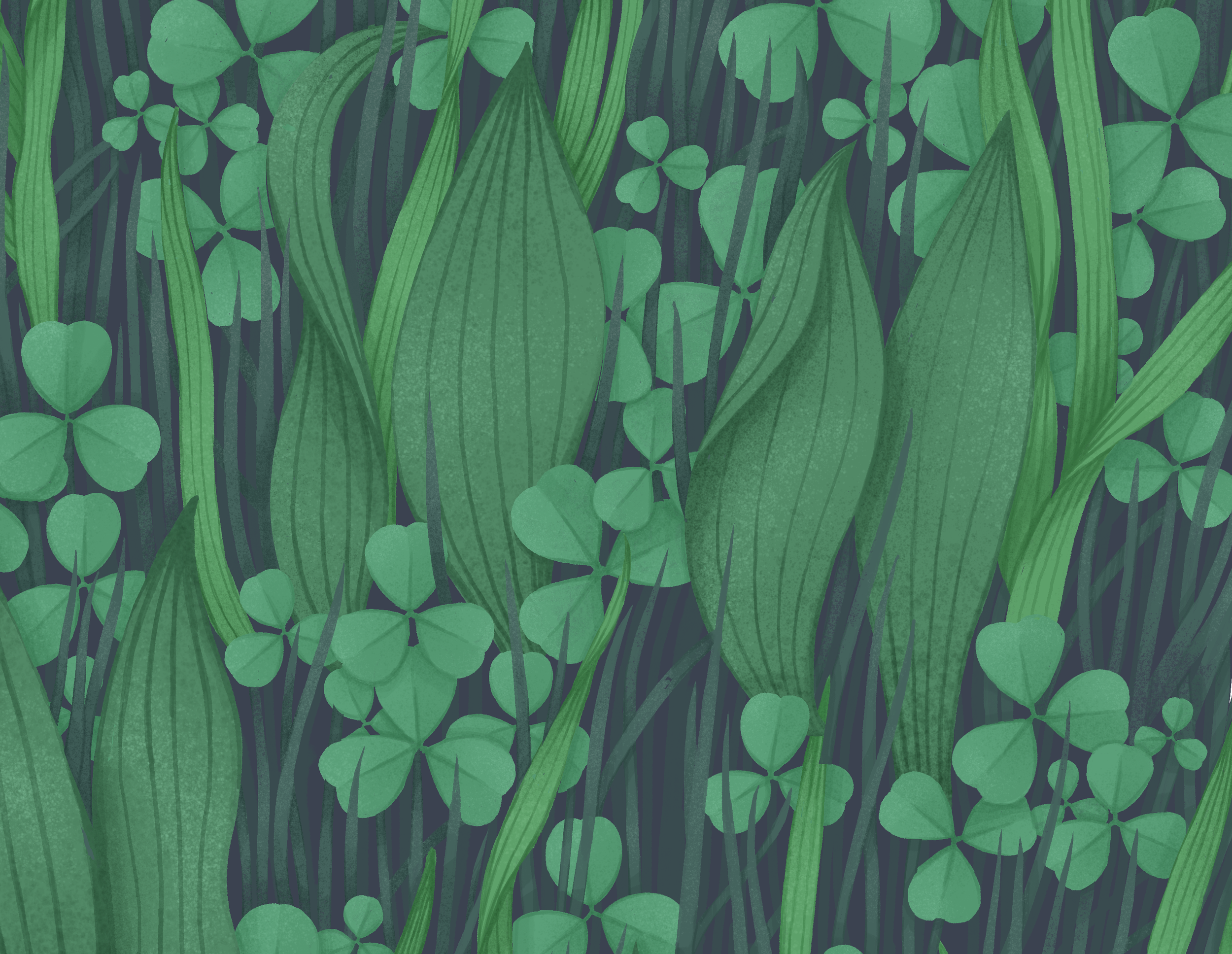 An illustration celebrating clovers and grasses, as well as yelllow and white daisies. The composition displays a wall of greenery with a naturally formed edge.
