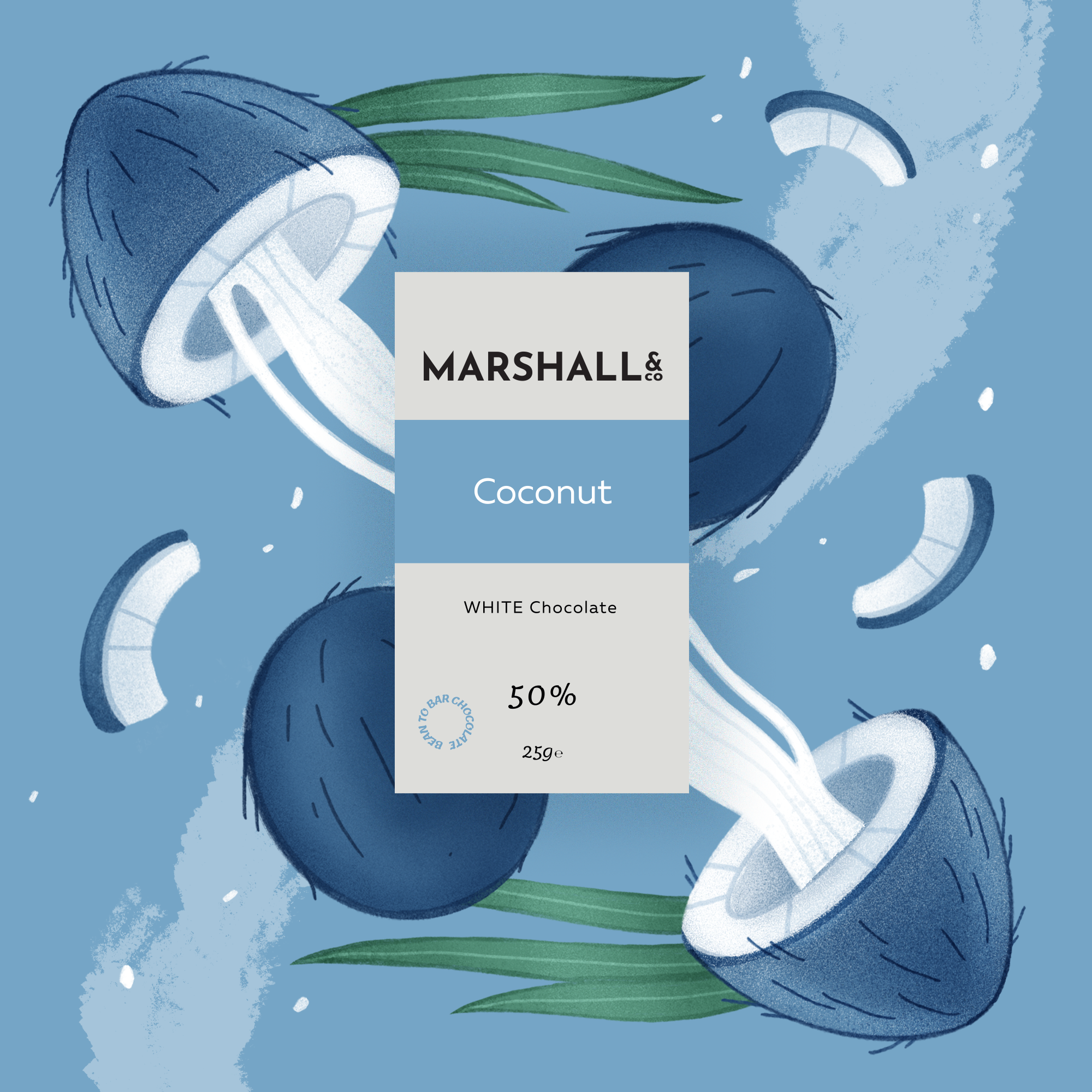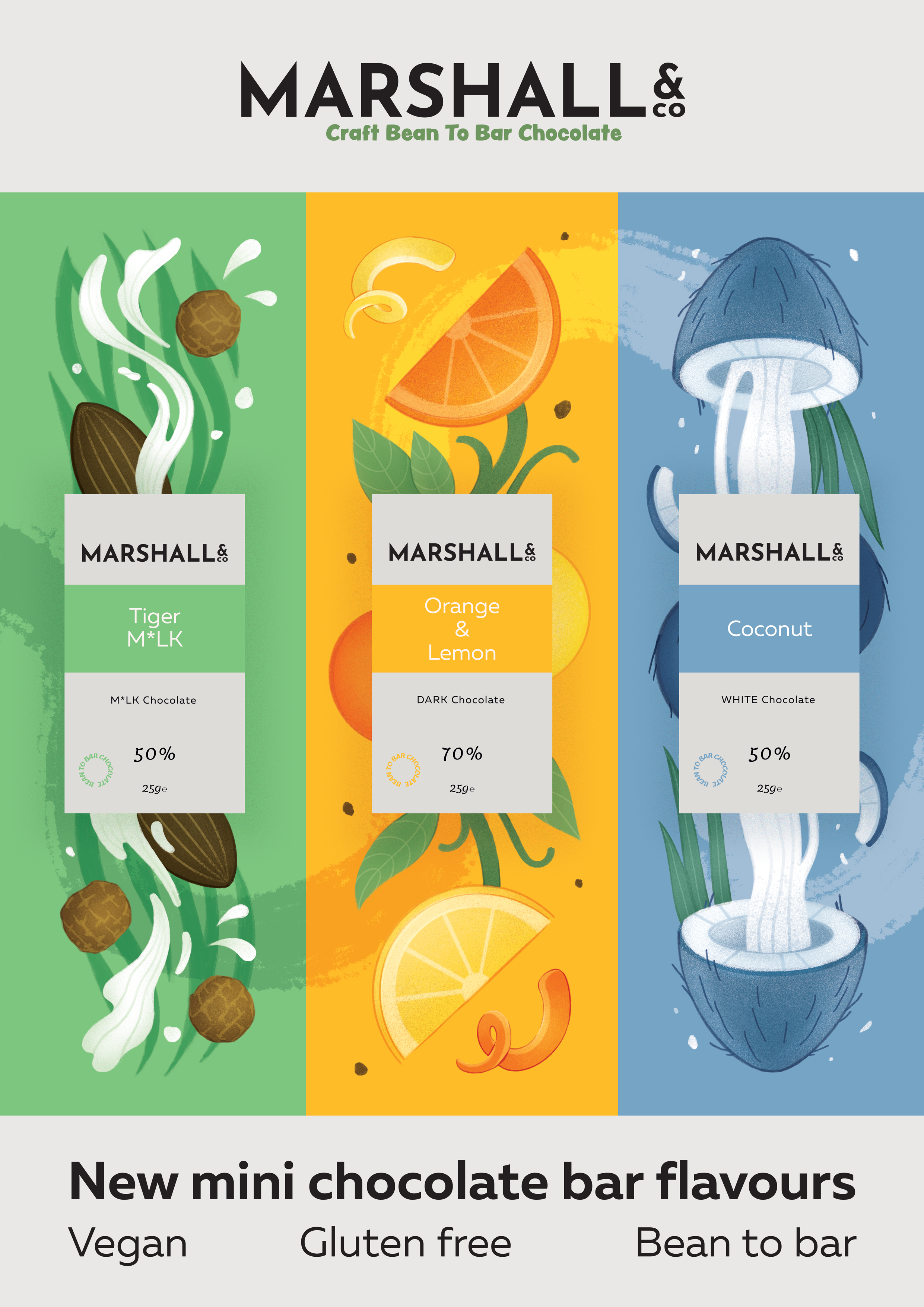 Marshall&Co are an award-winning craft, bean to bar, vegan and gluten free chocolate brand based in Birmingham. They required a design to promote a new line of products: three mini chocolate bar flavours. The design is used to promote the new products on social media as well as on printed posters at the company’s pop-up events.