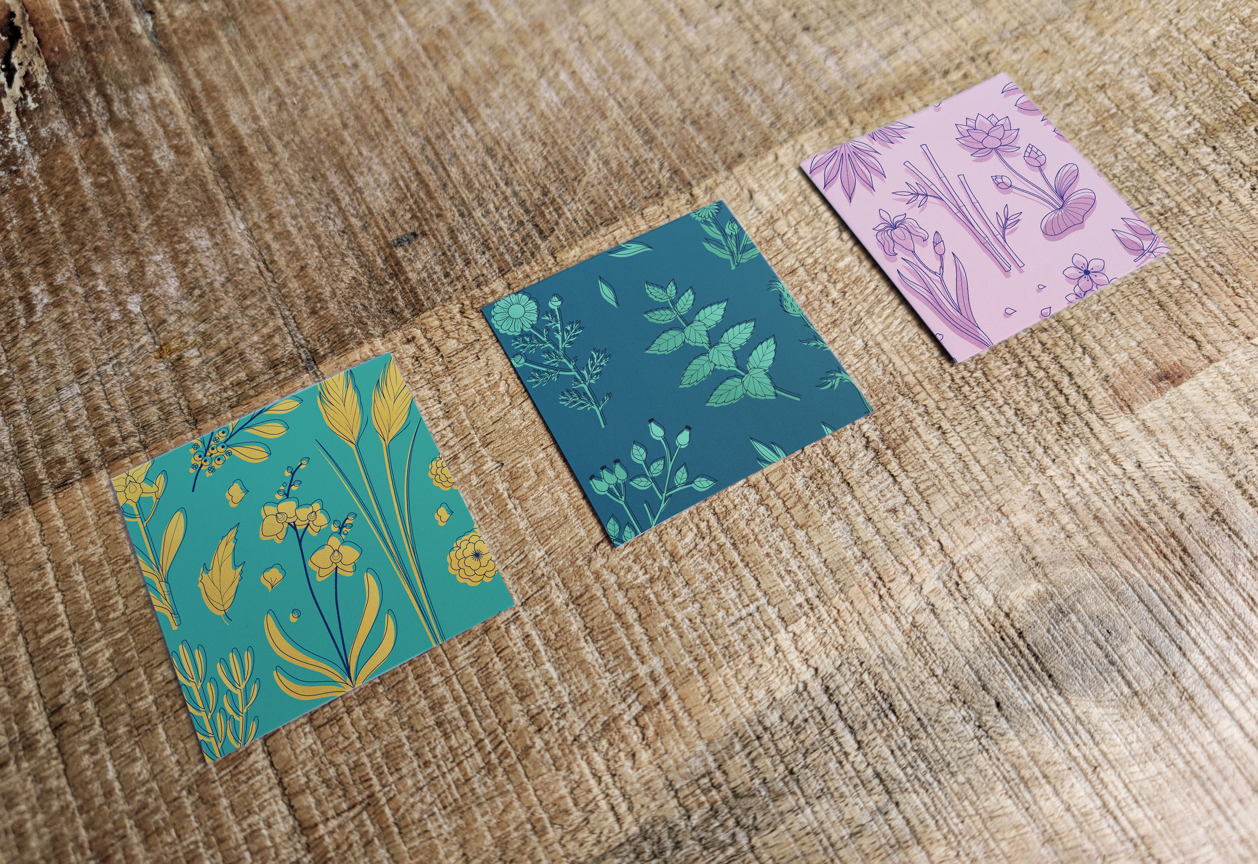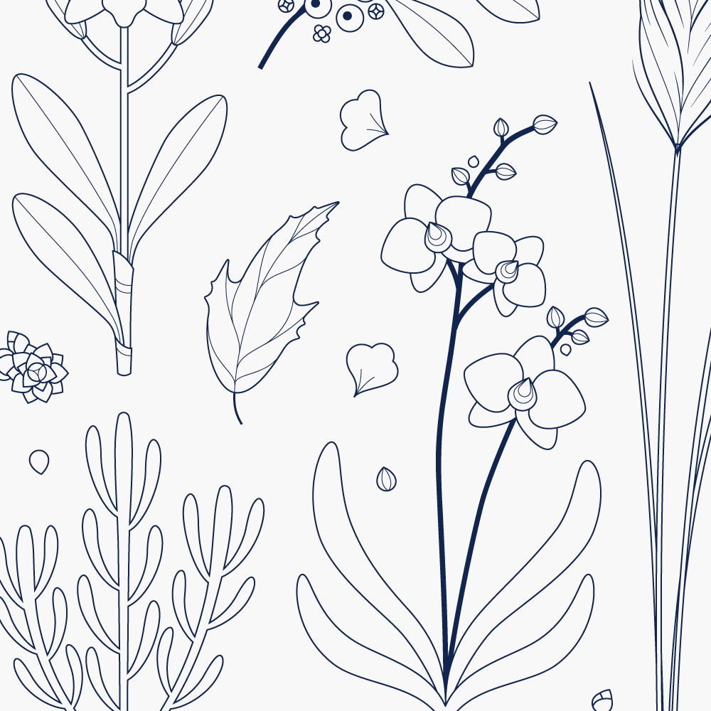 These repeated pattern illustrations represent plants native to different continents in the world. While compositional similarities echo across these designs, the colours provide something unique to each pattern.