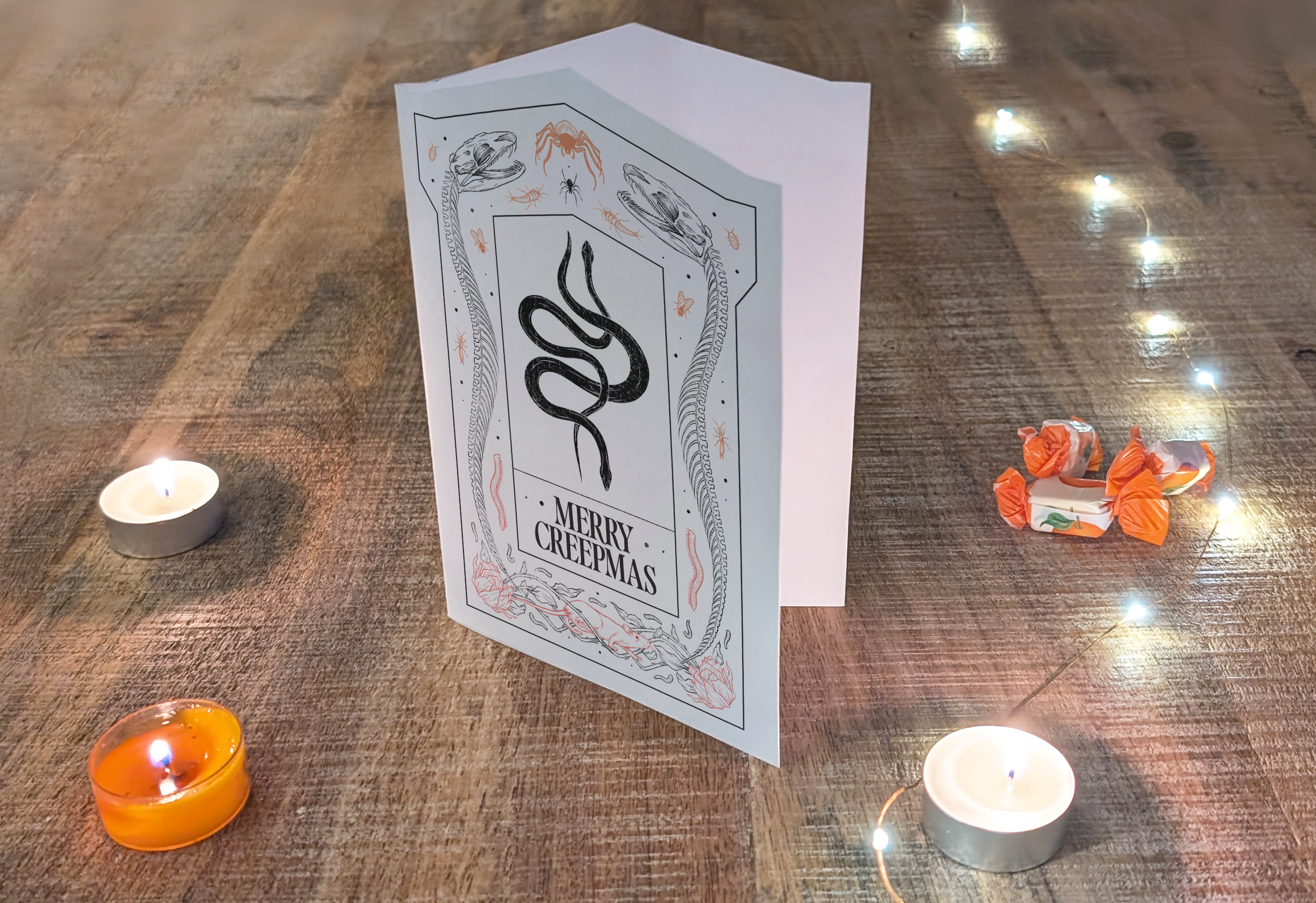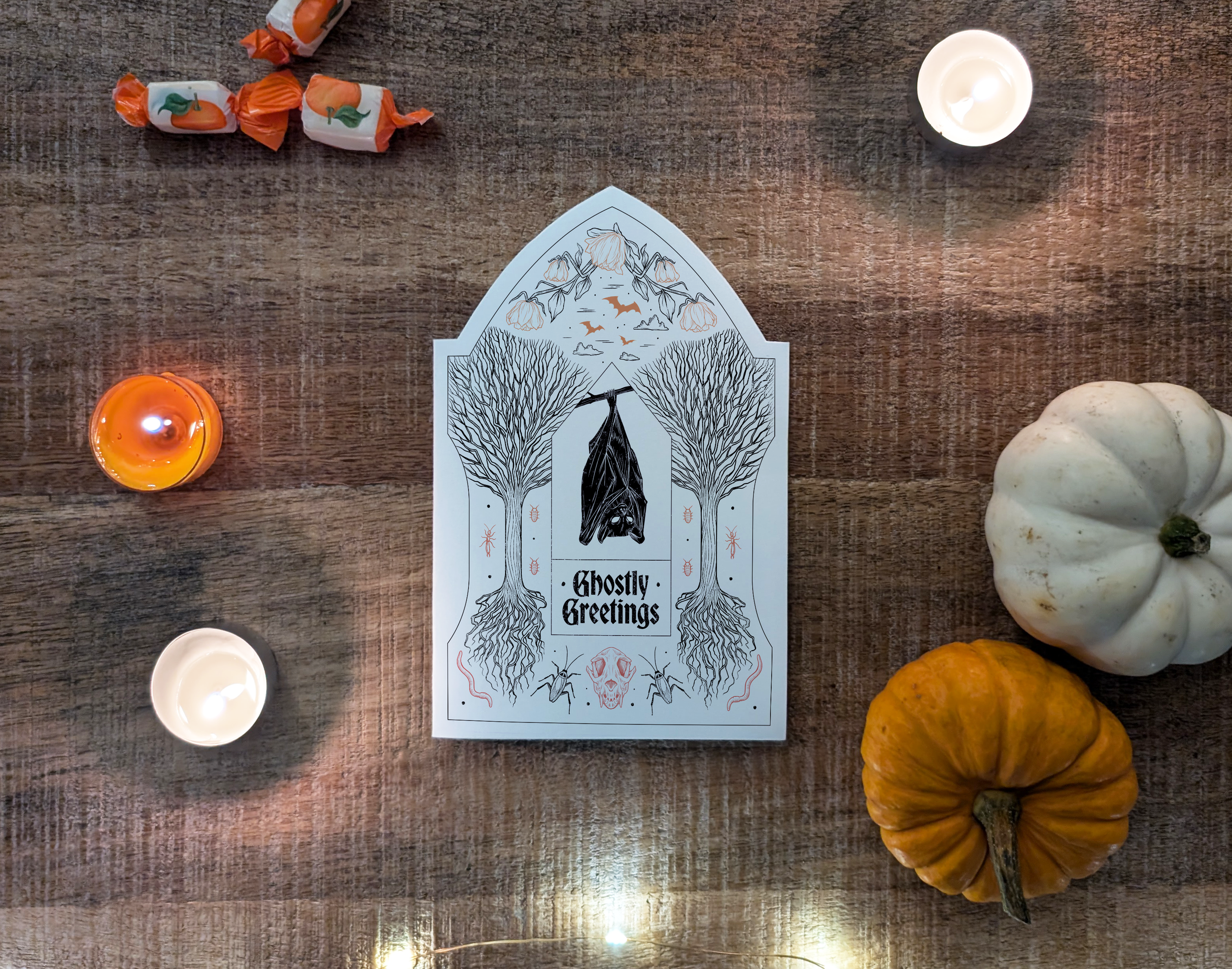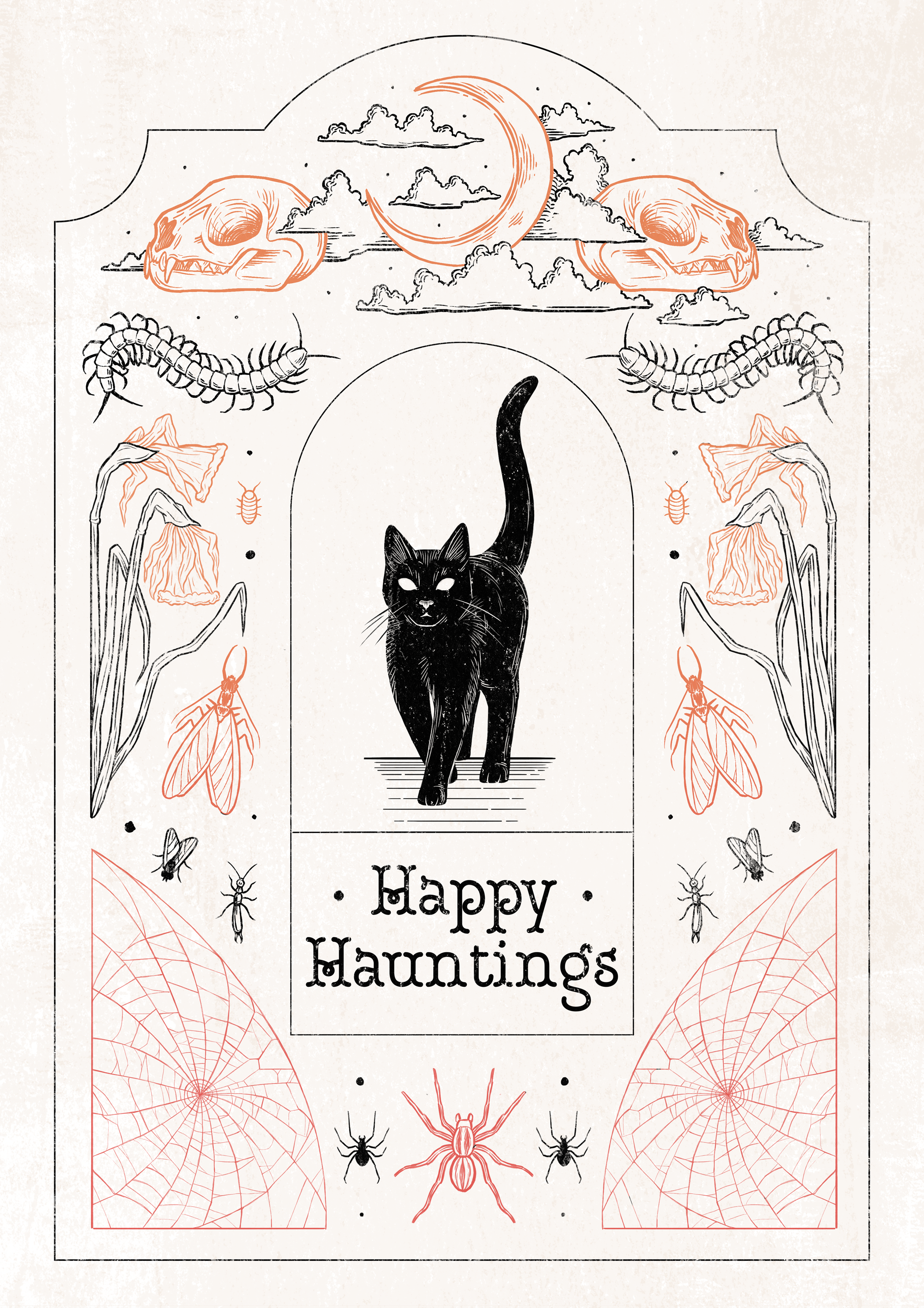 This series of spooky creature illustrations for Halloween comprises 4 motifs, each with a different Halloween-themed animal featured at the center of the composition.